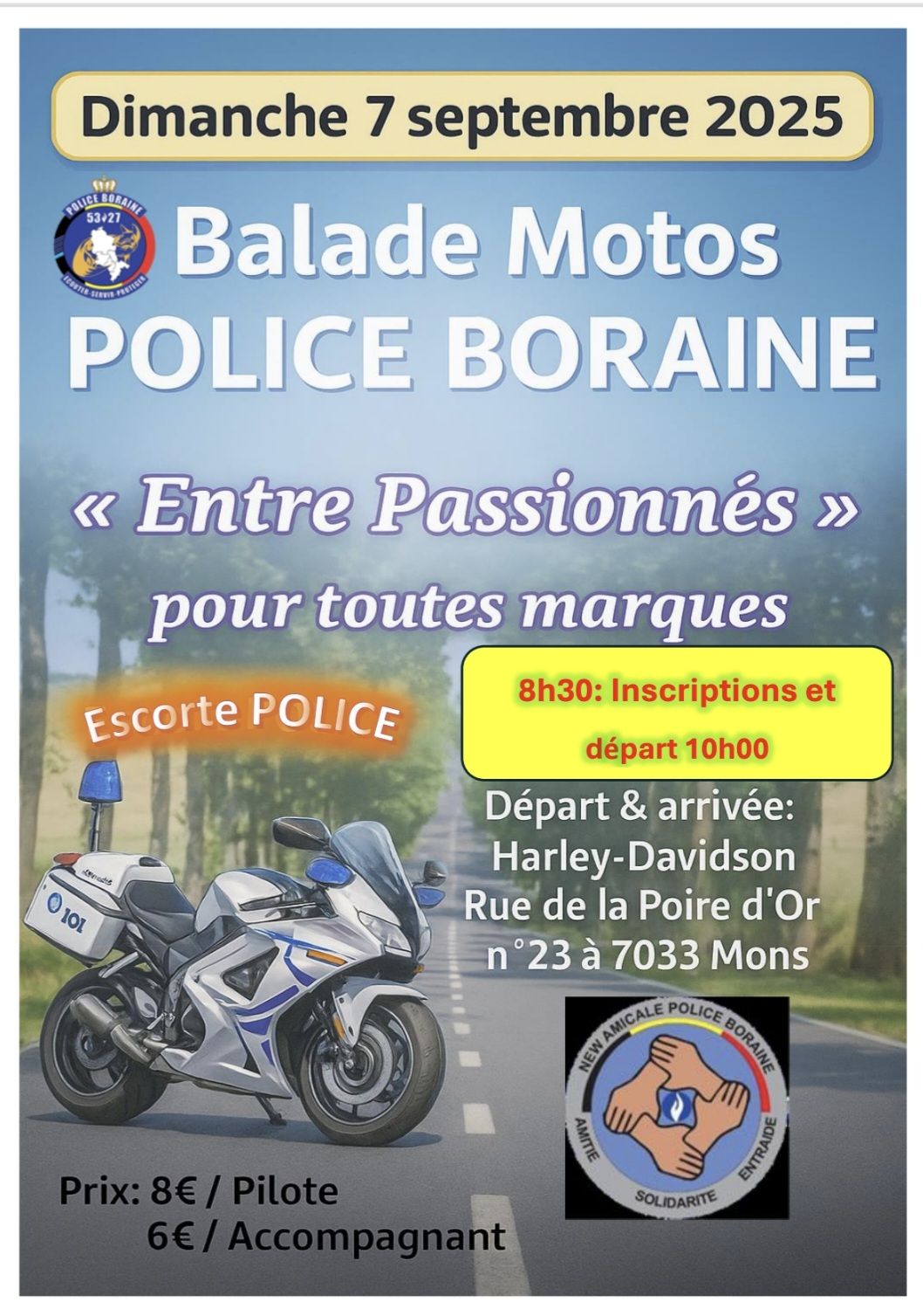 Le dimanche 7 septembre aura lieu la grande balade motos toutes marques organisée par la New Amicale de la Police Boraine.